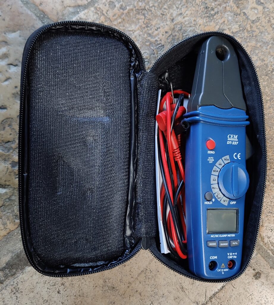 Une pince ampèremétrique permet de mesurer le courant sans devoir couper un fil, donc un gros gain de temps. Celle-ci est assez précise et peut mesurer des courants de quelques milliampères malgré son calibre maxi de 80 ampères, ce qui est pratique pour mesurer des pertes par exemple.