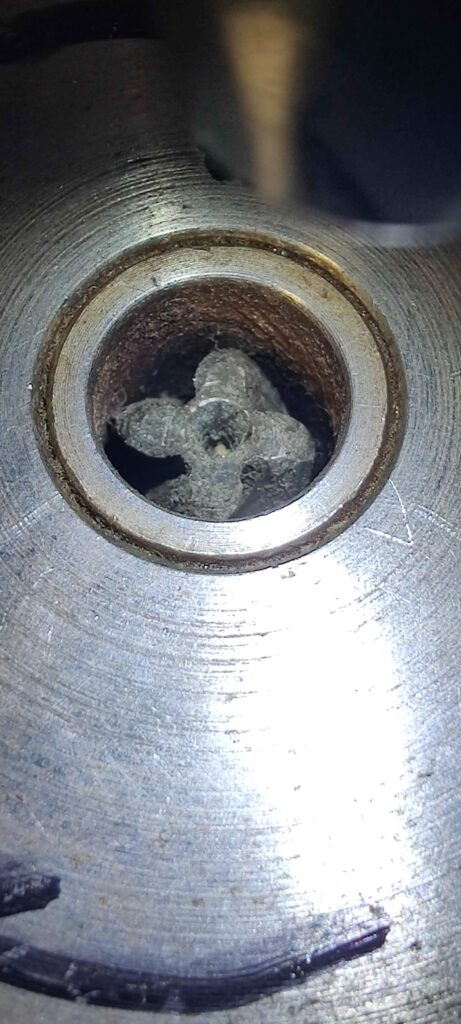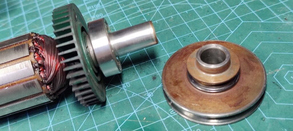 Le bout d’arbre moteur semble étrange, une vis Torx mâle à 4 lobes en hélice ? Non, il s’agit du bout d’arbre moteur, à l’origine un pignon formé sur l’arbre pour une réduction avec un engrenage à denture inclinée. Une douille a été montée serrée sur l’arbre, pour permettre d’y monter une poulie emmanchée avec un léger serrage.