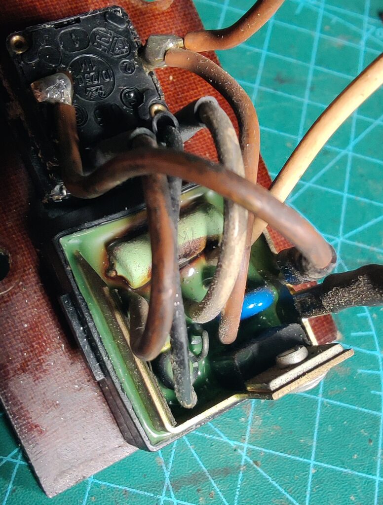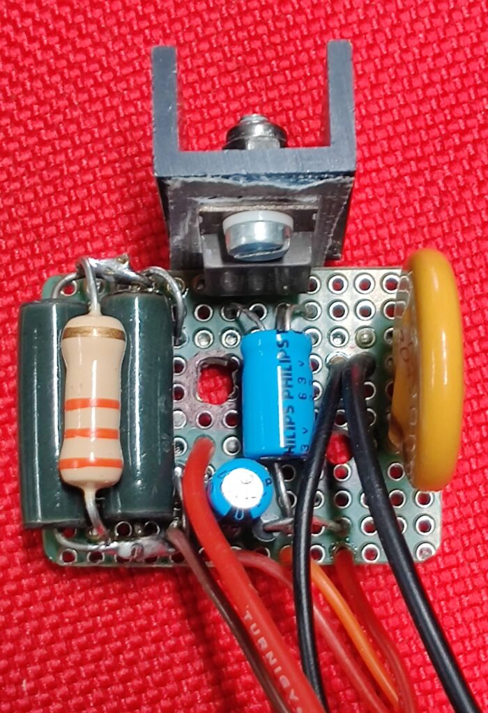 Le variateur très basique de la perceuse, un seul thyristor et 6 composants (deux diodes, deux condensateurs, une résistance, un varistor :
