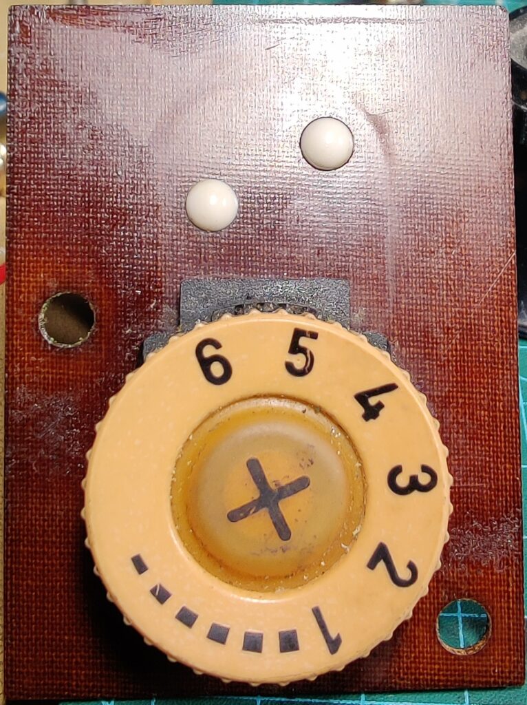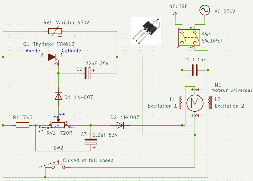 Le schéma du variateur à thyristor, montage série. L’interrupteur poussoir SW2 permet d’obtenir la pleine vitesse en court-circuitant le thyristor. D’origine il se ferme probablement automatiquement lorsqu’on tourne le potentiomètre sur la position 6. Il était fermé en permanence sur ma machine, ce qui a rendu difficile la compréhension du système.