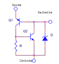 Le fonctionnement d’un SUS s’explique facilement à l’aide de son circuit équivalent ci-dessous. Il se déclenche lorsqu’une tension fixe, déterminée par sa diode à avalanche, est appliquée entre l’anode et la cathode. La gâchette du SUS n’est utilisée que si l’on désire une synchronisation ou une commutation forcée. Elle permet par exemple un contrôle fin la tension de déclenchement.