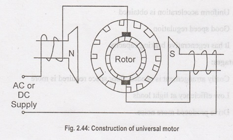 C’est un moteur DC à balais à excitation par deux pôles saillants sur le stator. Un moteur universel est similaire à un moteur DC à balais, modifié pour un fonctionnement correct en courant alternatif. Contrairement à un moteur DC qui peut fonctionner avec des aimants permanents à la place des bobines d’excitation, un moteur universel a toujours besoin de bobines d’excitation : c’est l’inversion du champ magnétique à la fois dans le rotor et dans le stator qui permet d’avoir un couple toujours orienté dans le même sens et donc de tourner normalement en courant alternatif.