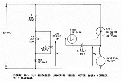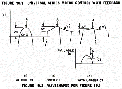 Les circuits des Figures 10.1 et 10.3 fournissent un courant continu redressé en simple alternance au moteur. Pour obtenir une vitesse maximale avec ces circuits, le moteur doit être conçu pour une tension nominale d’environ 180 volts lorsqu’il fonctionne sur le secteur 240 volts.