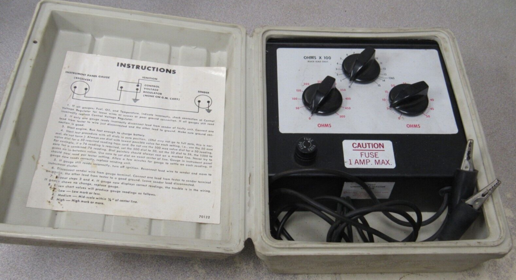 Pour tester les jauges, on peut utiliser un simulateur de capteur. C’est simplement un rhéostat calibré, qui permet de simuler la résistance d’un capteur. On alimente la jauge en 14V avec le simulateur en série dans le circuit.